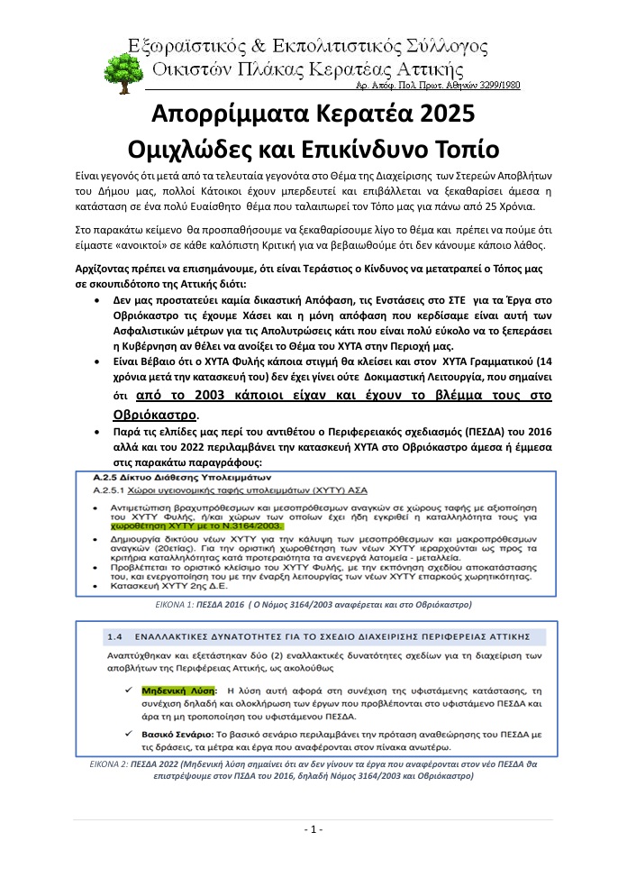 Απορρίμματα Κερατέα 2025.... Ομιχλώδες και Επικίνδυνο ΤοπίοΕίναι γεγονός ότι μετά από τα τελευταία γεγονότα στο Θέμα της Διαχείρισης των Στερεών Αποβλήτων του Δήμου μας, πολλοί Κάτοικοι έχουν μπερδευτεί και επιβάλλεται να ξεκαθαρίσει άμεσα η κατάσταση σε ένα πολύ Ευαίσθητο θέμα που ταλαιπωρεί τον Τόπο μας για πάνω από 25 Χρόνια.